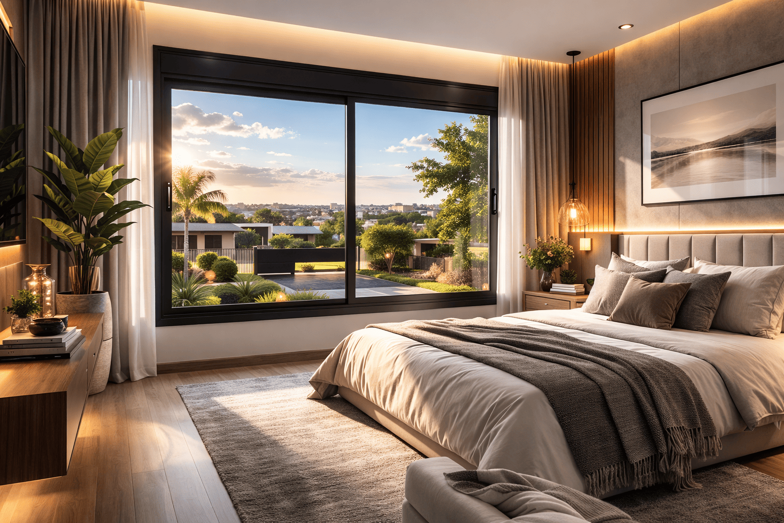 A persiana integrada motorizada garante controle da luz e privacidade com acionamento suave e silencioso, mantendo a estética clean e elevando o padrão de conforto do ambiente.